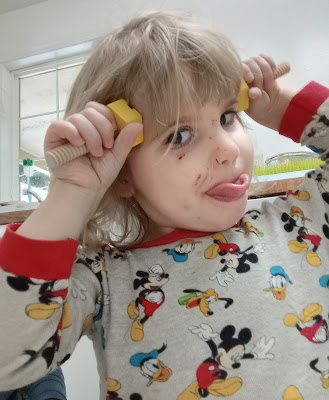 TerraDactyl was playing around with some alphabet stickers and she held up the two "o's" and said, "these are mynoculars". She's got a pretty great imagination. It's always interesting to see what she'll pretend an object is. And sometimes, she doesn't even need an object. She'll just grab some invisible thing and start playing with it.